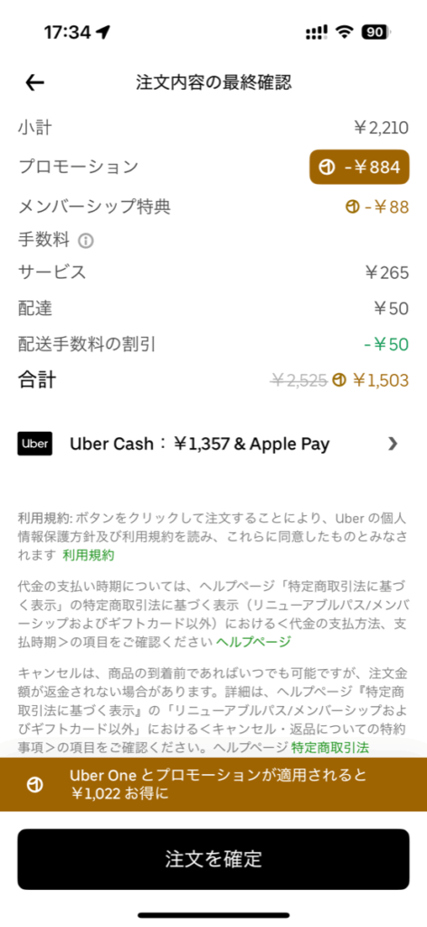 金額は最終的に1,503円でした。これでも多分お店で食べる時の2割増しぐらいの金額に落ち着いた感じ。デリバリーアプリのプラットフォーム手数料の高さが窺えますねぇ。