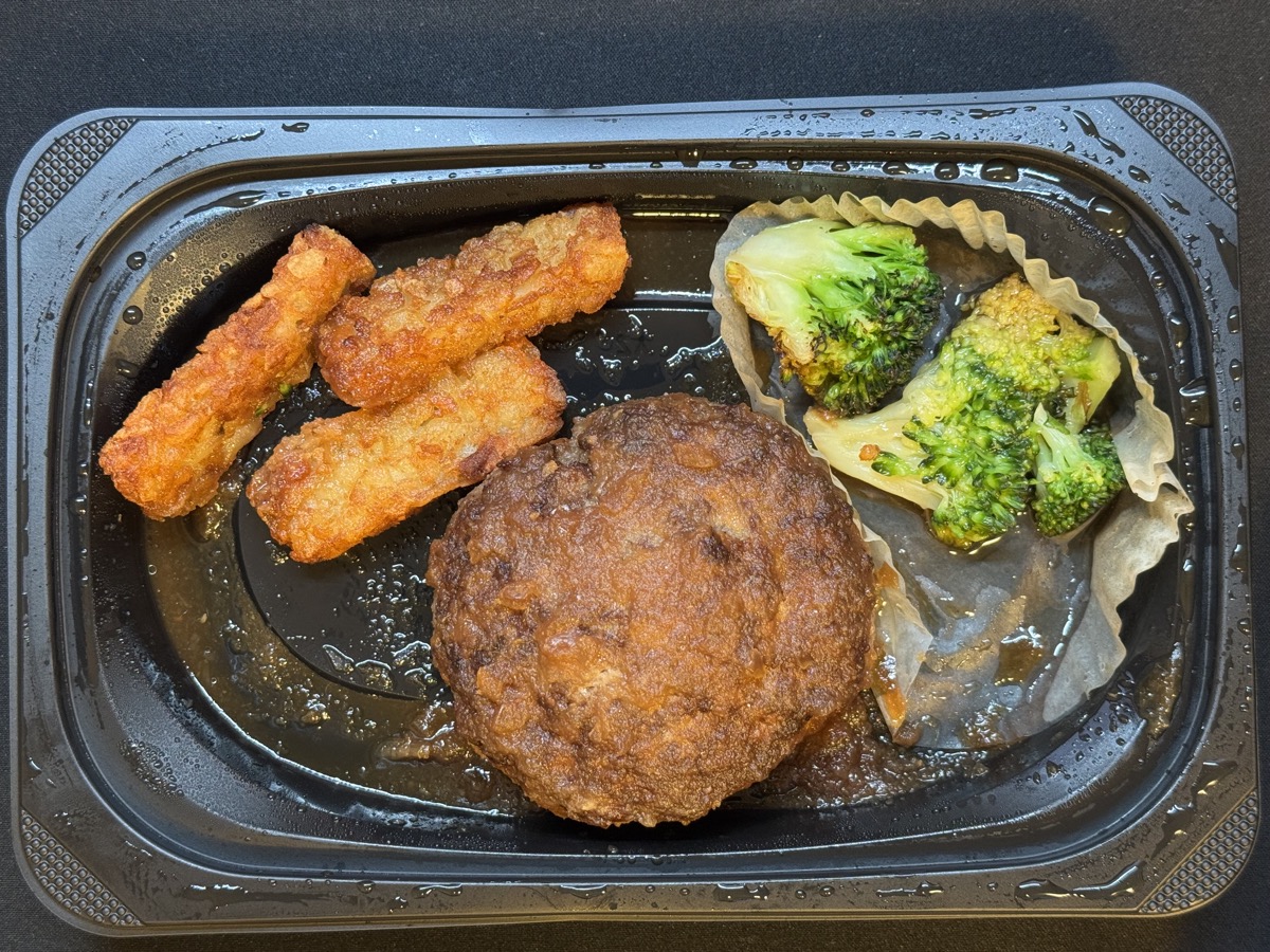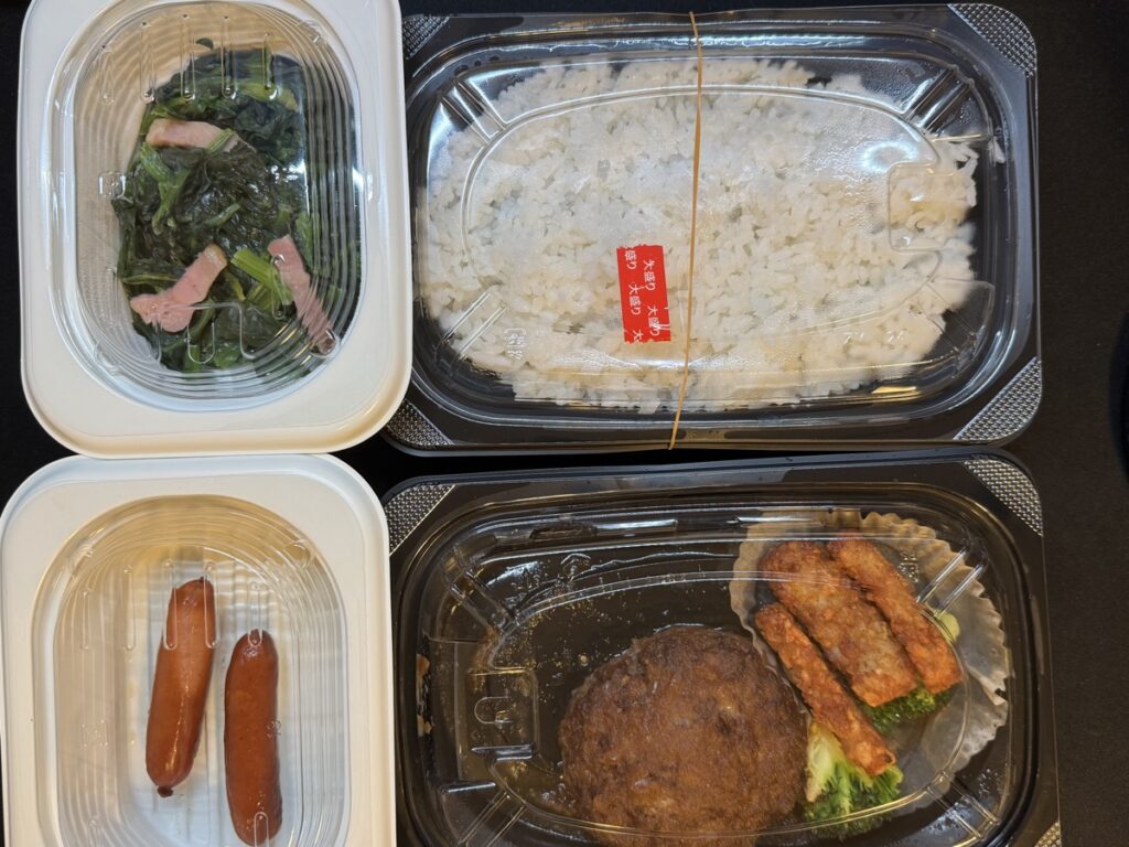 ハンバーグは200g近くあるので食べ応え十分ですね。ポテトとブロッコリーは可もなく不可もなく。ソーセージは市販のウィンナーだと中々見つからない味で旨い。ほうれん草ベーコンは今回ちょっとハズレだったかも。普段はもう少し美味しい気がする。