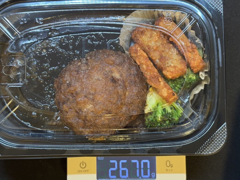 早速計量してみます。ちなみに白い容器+フタが16g、黒い容器+フタが30gです。ハンバーグは概ね200g近くのボリュームであることがわかります。白米も300g〜320gあたりとこちらも多い。