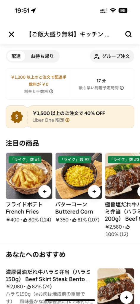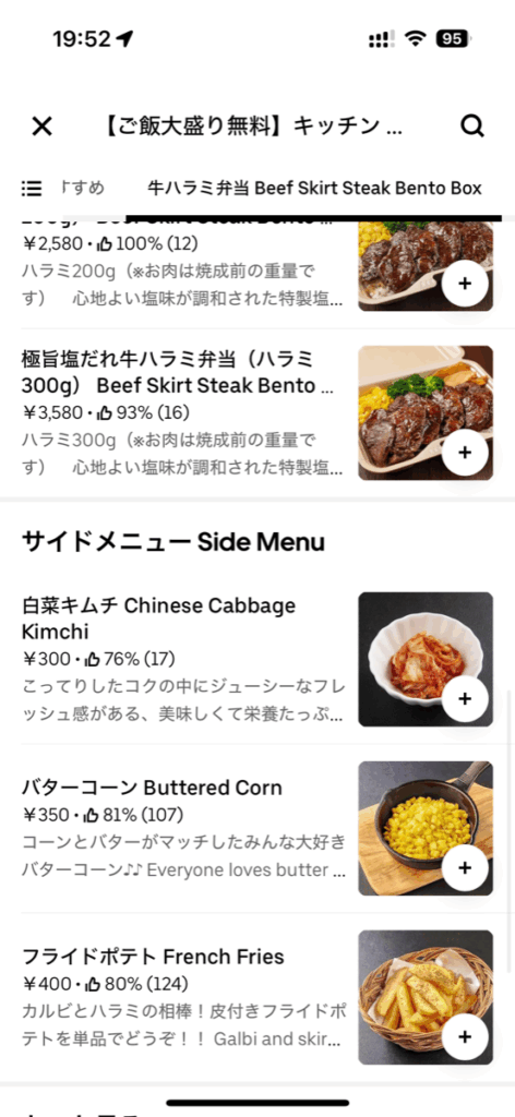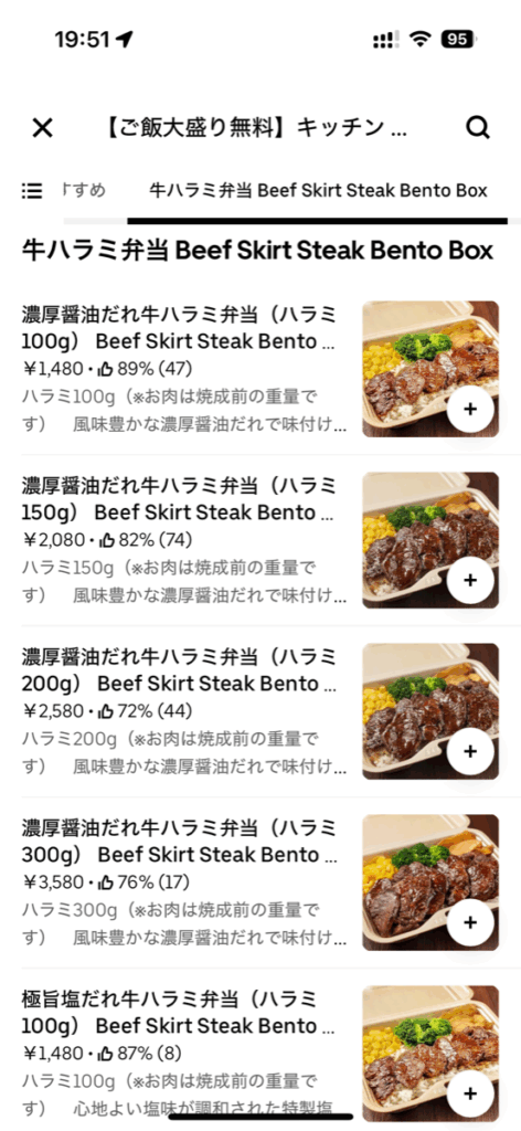 近所の店舗だとハラミ弁当メインでした。カルビ弁当は見当たりません。UberOne特典キャンペーンの1,500円以上で40%オフ対象店舗でした。