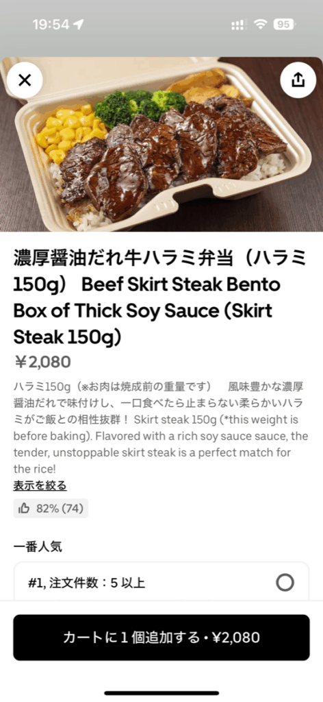- 濃厚醤油だれ牛ハラミ弁当(ハラミ100g):1,480円(支持率89%)