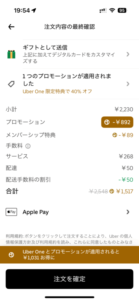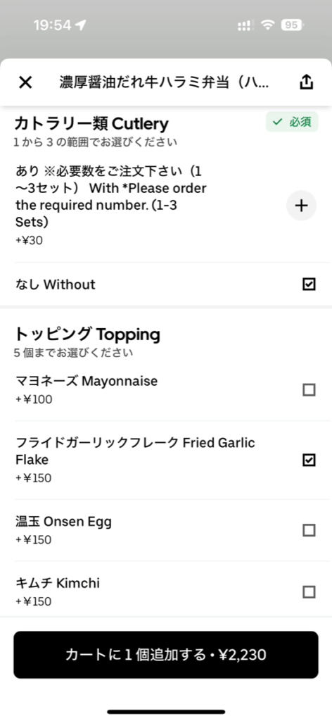 カトラリーは有料、トッピングにフライドガーリックフレークを入れてみました。UberOne限定特典キャンペーンで40%オフになるので最終的に1,517円でした。牛ハラミ100gだと1,480円でギリギリ足りませんが、カトラリー入れれば1,500円はクリアできますね。