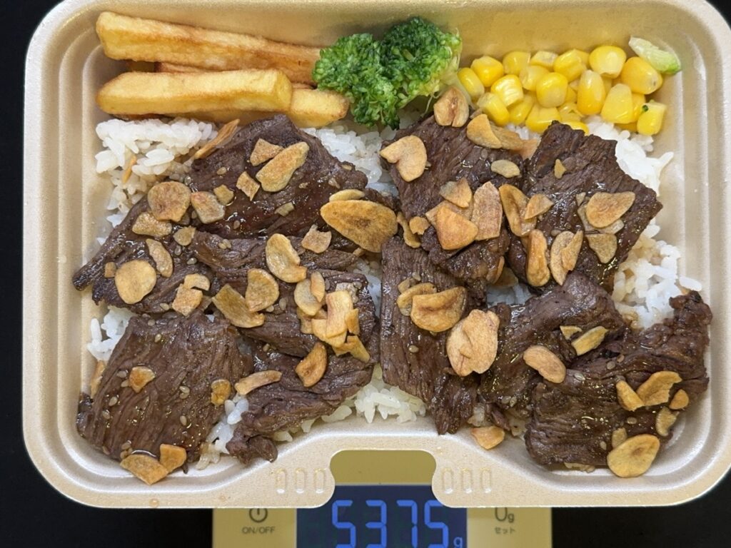40分ぐらいで無事到着。計量すると537.5gでした。ご飯が330g程度、牛ハラミが150g程度しっかり入ってる模様。副菜はフライドポテト、ブロッコリー、コーンで50g程度ってところ。