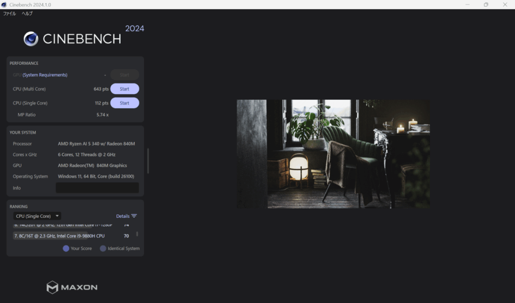 続いてIdeaPad 5 2-in-1 Gen 10。こちらもチューニングなど全く施してない初期状態で測定。CPU(Multi Core)643ptsで約4倍、CPU(Single Core)が112ptsで約1.5倍の性能差になりました。世代的に3年か4年ぐらいの差だと思うんですが進歩すごいですね。ベンチマークサイトだとRyzen AI 5 340のマルチは800程度出るらしいので、こちらもチューニング次第では伸びそうな感じもします。