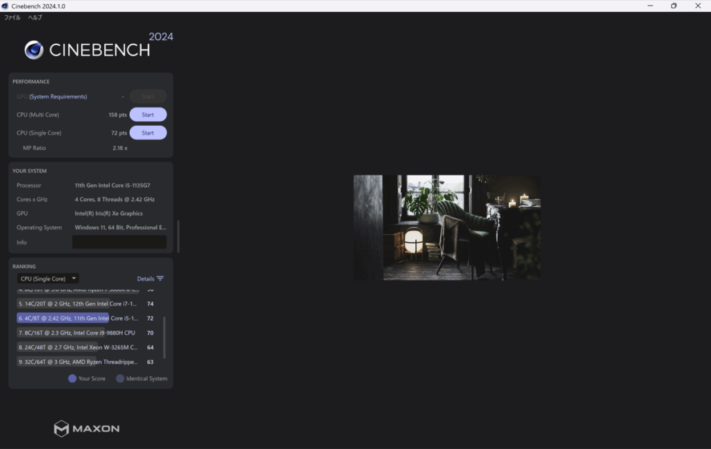 とりあえずCINEBENCH2024を実行してみました。先行はSurface Pro 7+。ほとんどチューニングしてない状態でCPU(Multi Core)158pts、CPU(Single Core)が72ptsという結果。ベンチマークサイトだとi5-1135G7はマルチで200程度との記載があるので、Surface Pro 7+側の排熱や性能設定周りを弄ればもう少し頑張ってくれそうな感じはある。
