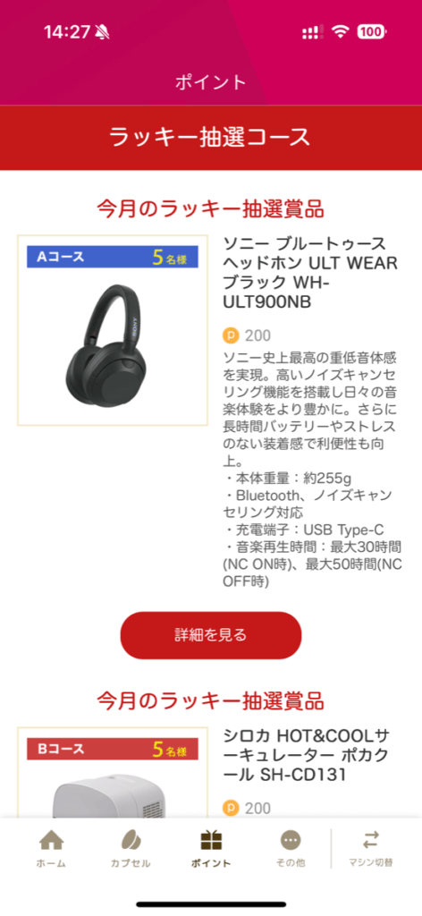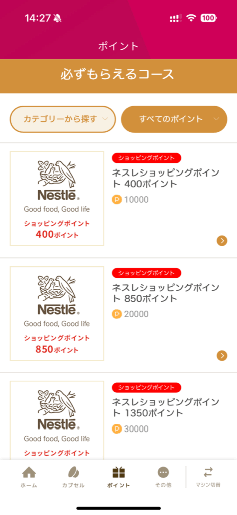 一応ポイントの逃げ口として、ネスレショッピングポイントやラッキー抽選コースがあります。ただ、QRコードを通す手間の割に合っているかというと少し疑問です。抽選は当たる気しないし、ネスレショッピングも還元率はやや渋めな印象。単純計算で60,000円分カプセル買って1,350円還元みたいなイメージ。大体2%ぐらいですね。