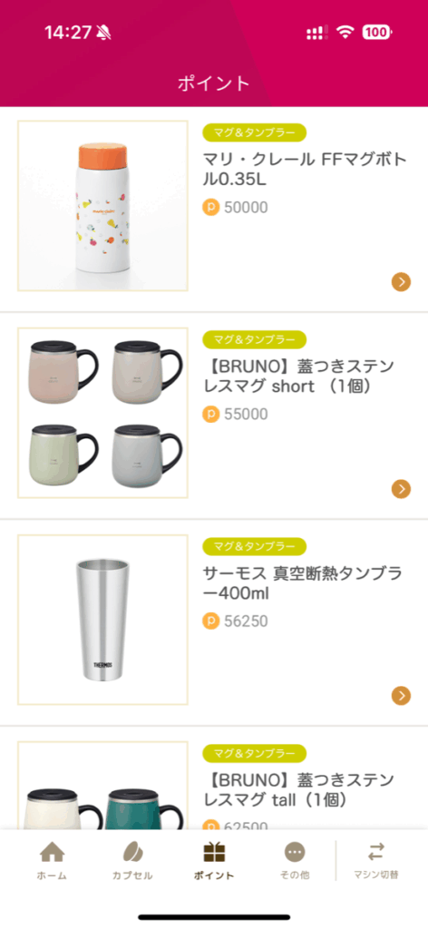 ネスカフェアプリのポイント交換商品ですが、概ね50,000ポイントが最低ラインです。数年前はミニスプーンみたいなアイテムだと20,000ポイントとかでゲットできたのですが、現在のラインナップでは見当たりませんでした。在庫状況などに応じて流動的なのかもしれません。