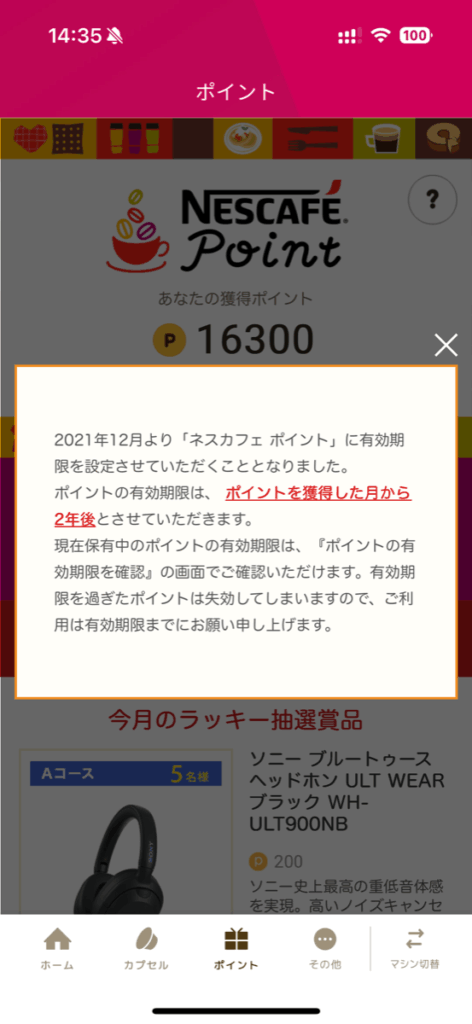 ネスカフェポイントの有効期限が取得から2年です。短期間でポイントを貯めないと、どんどん消滅していくわけです。かつては無期限でしたが、2021年12月から有効期限システムが導入されてしまいました。