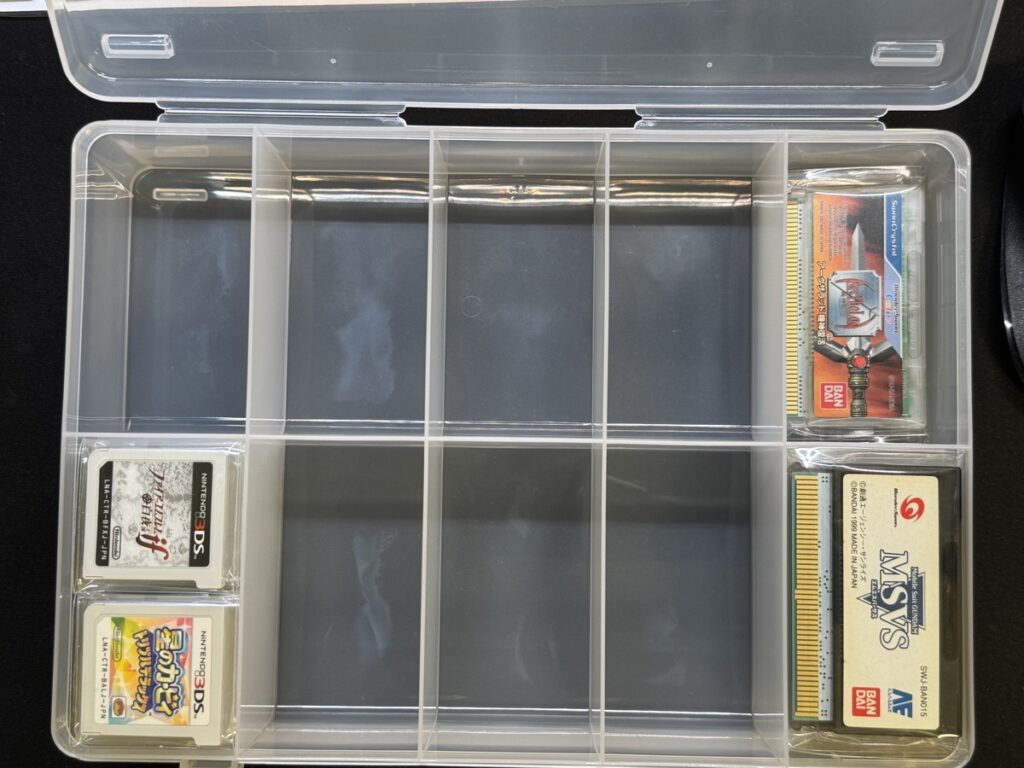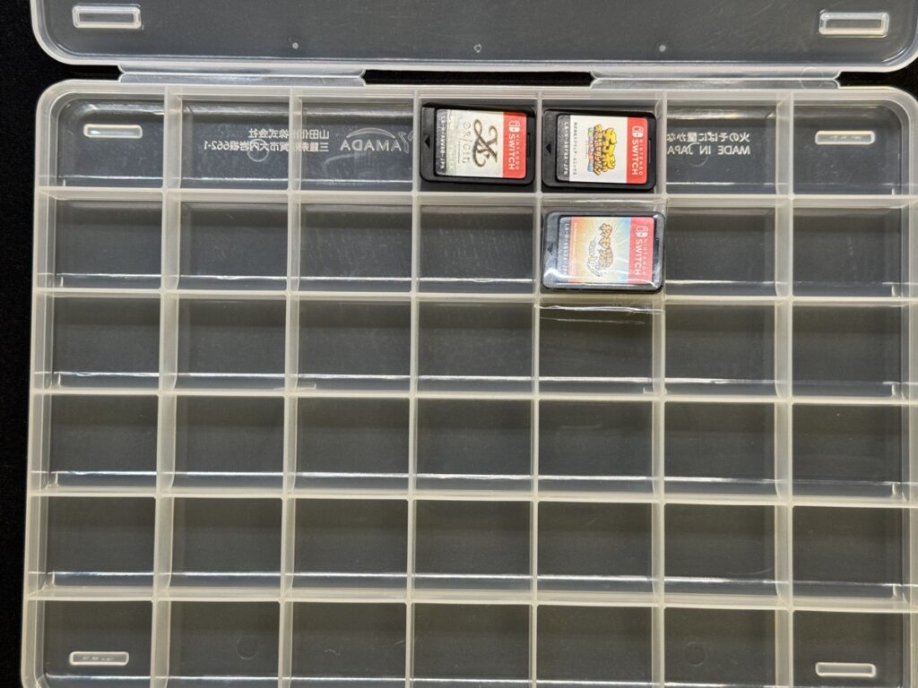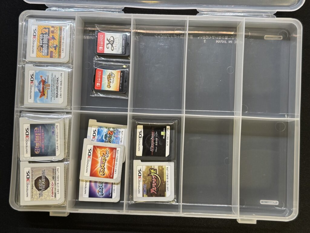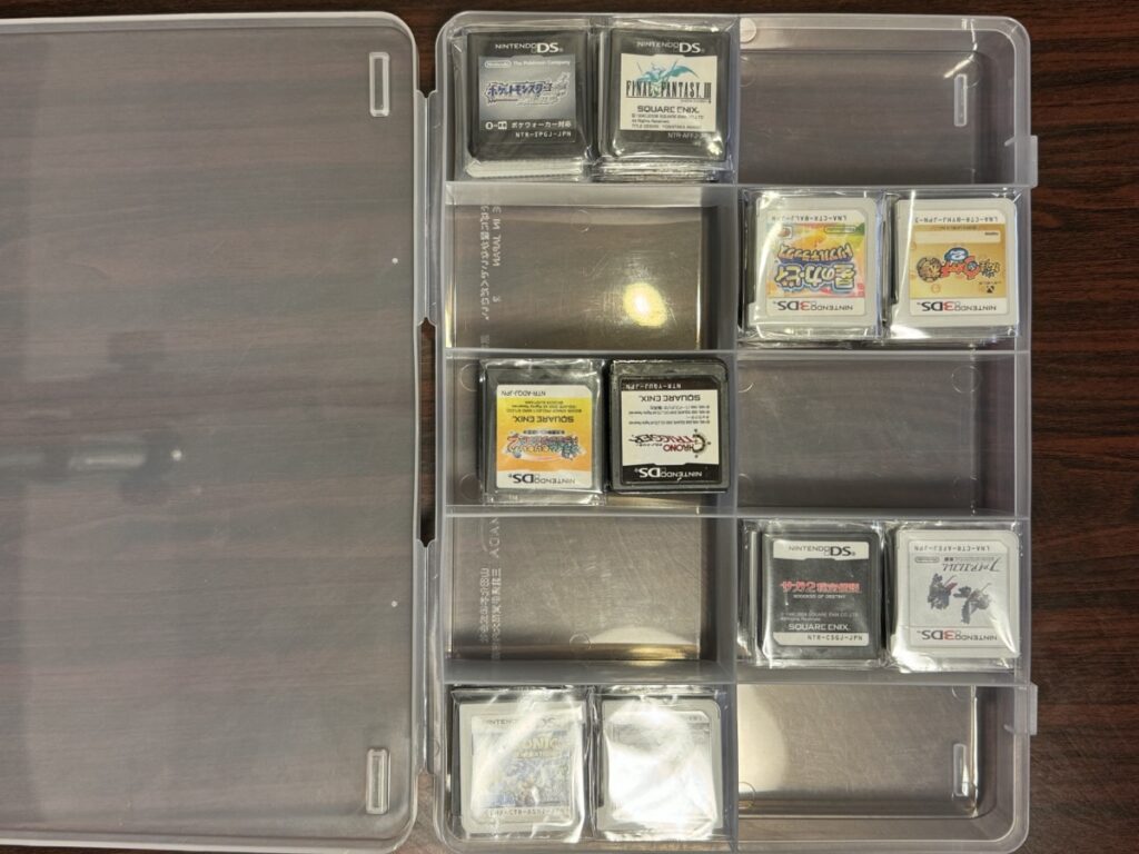 収納ケースは「SIKIRI 10」です。DSソフトはサイズが小さく、一枠あたり12本は入ります。合計120本収納できますね。最近は「SIKIRI 10 深型」なんてものもあります。こちらは1枠あたり20本〜22本ぐらい入ります。大量にDSソフトを保有しているなら深型を買うのもアリです。