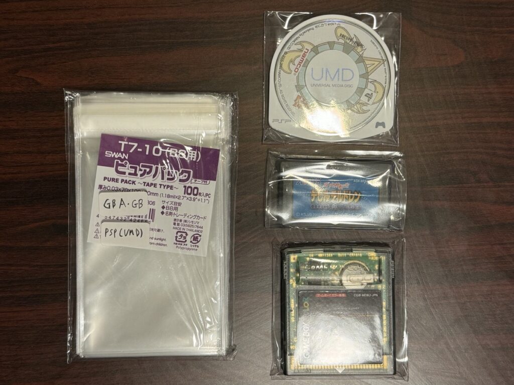 OPP袋はクリスタルパックのT7-10がベターか。ジャストフィットかと言われると微妙。特にGBAは縦幅が小さいので余り気味なのが気になるところ。