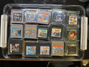 自分はゲームボーイの本数が増えすぎたので、大きめの収納ボックスを購入しました。本来はドキュメント用のスタッキングボックスのLサイズ。40本ぐらいで30%〜40%ぐらい埋まってる感じなので120本ぐらい入りそう。