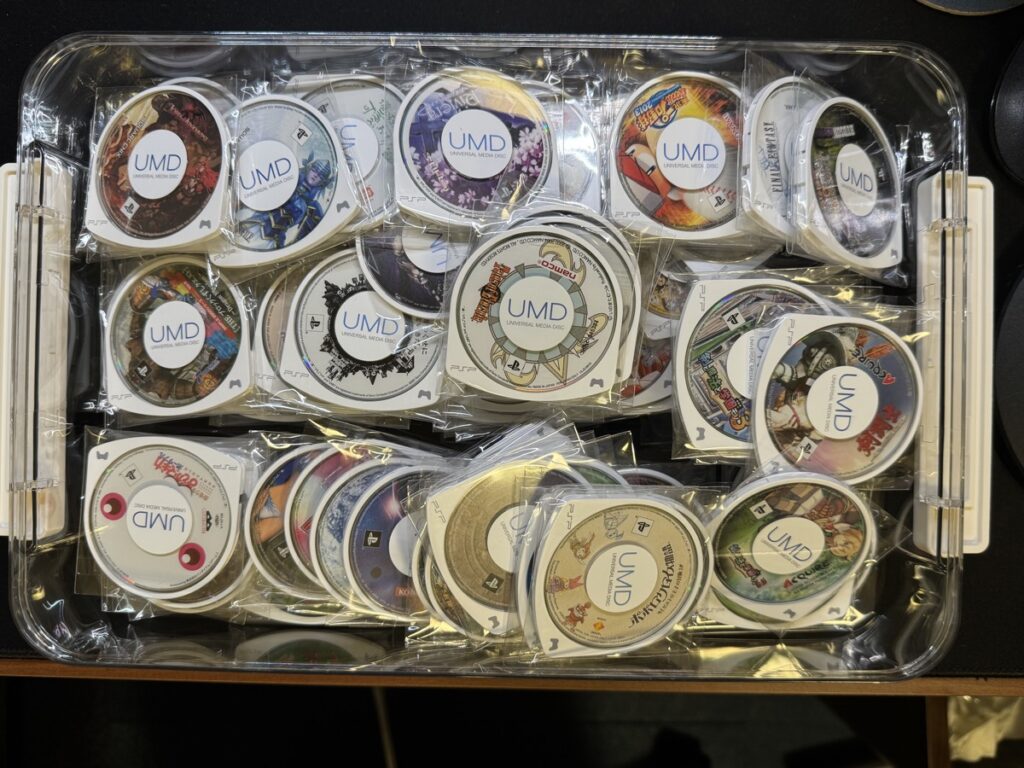 なお、本数が多くなりすぎたので適当な箱に入れることにしました。ゲームボーイ用に買ったドキュメントボックスですが、UMDのサイズには合ってなかったですね。まぁ90本で60%ぐらい埋まってるので、150本ぐらいは入りそう。