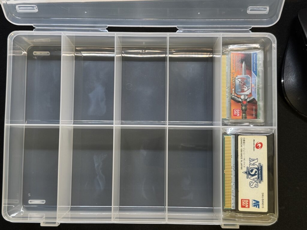 収納ケースは「SIKIRI 3V」がオススメです。一枠で9本入るはず。ネオジオポケットはタイトル自体が少ないので「SIKIRI 3V」が4ケースもあれば全タイトルコレクションできるんじゃないかと思います。