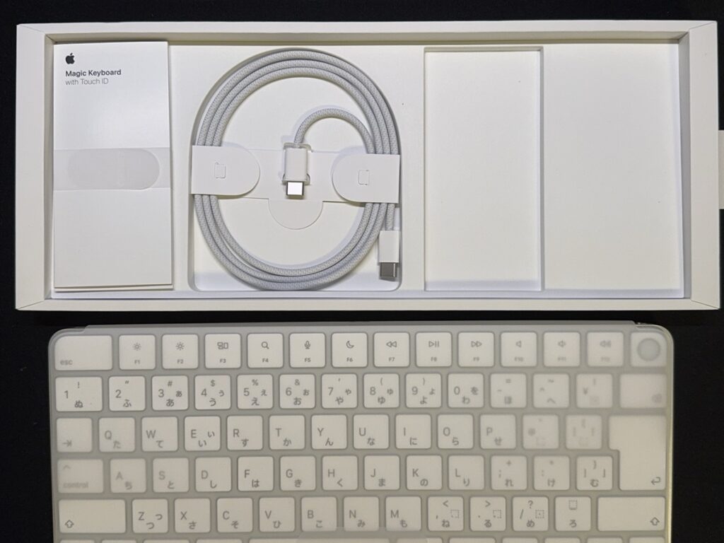 無事届いたので早速開封。内容物はこれまでのMagicKeyboardと同じですが、ケーブルがUSB-C to USB-Cに変わりました。