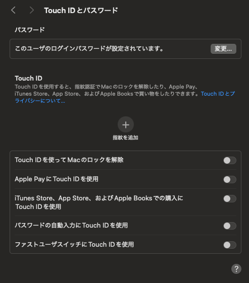 Macに再ログインするときとパスワード管理ソフトを起動するときのパスワードが生体認証でOKになりました。なお、Macへの初回ログインはFileVault(暗号化)の兼ね合いでパスワード手入力は継続です。これはちょっと想定外。暗号化を解除すれば使えるようですが、とりあえずそっとしておこう。