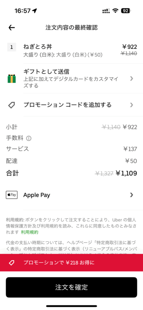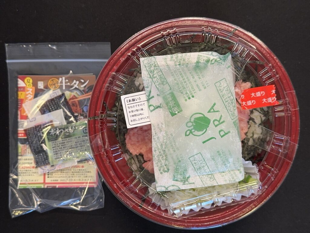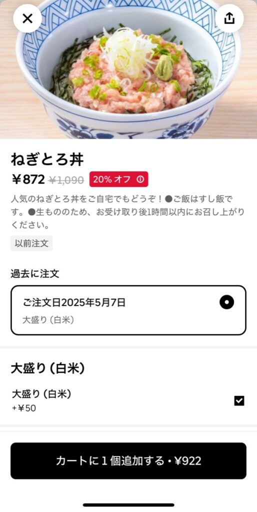 今日は海鮮の気分だったので、ねぎとろ丼に決定。もちろん大盛です。すかいらーく系列のねぎとろ丼は大盛+50円なのが嬉しいですね。配達料が安かったこともあり、UberOneの1,200円は諦めました。