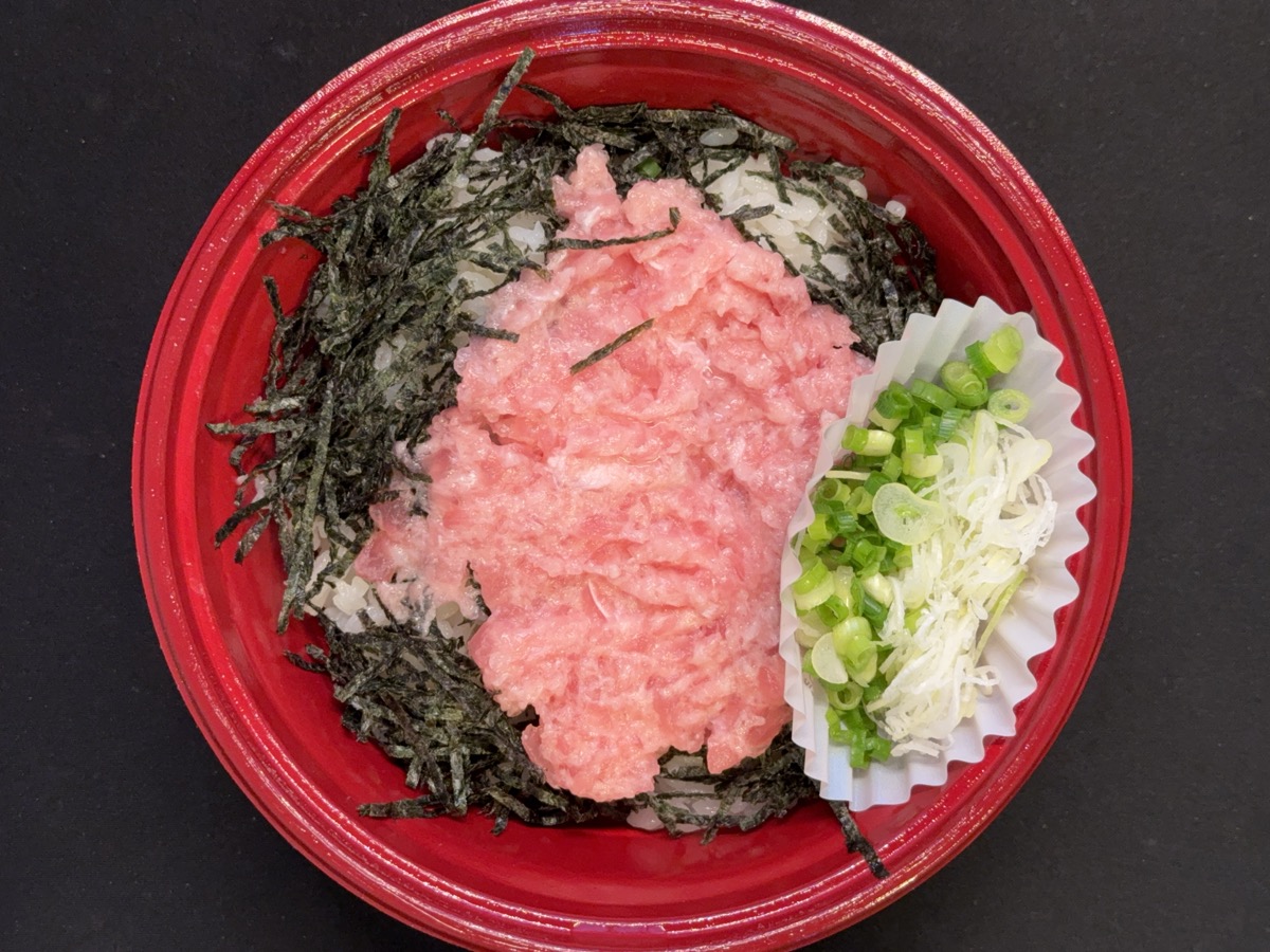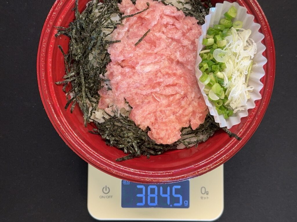 フタを外して計量すると384.5gでした。酢飯が恐らく300g程度、ねぎとろが70g程度といったところでしょうか。カロリー的には700kcalあたりかなー。